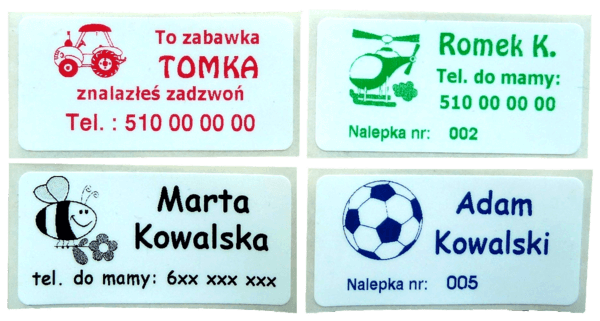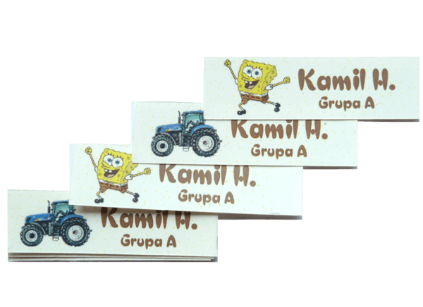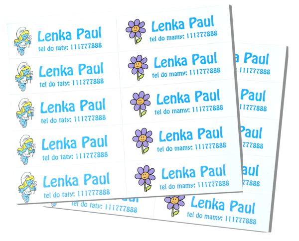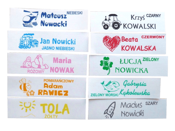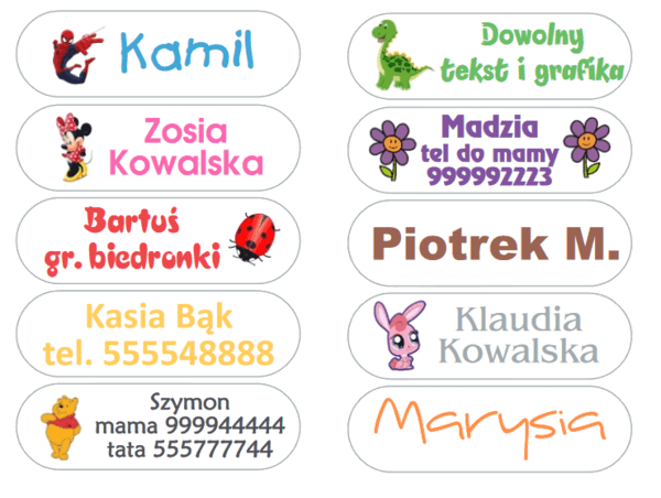 Szeroka gama obrazków, czcionek oraz kolorów pozwala na wykonanie oryginalnego oznaczenia, dzięki czemu nikt nie pomyli rzeczy Twojego dziecka. Oprócz imienia i nazwiska na imienniku możemy umieścić np.: grupę krwi, numer telefonu, nazwę lub numer grupy w przedszkolu, dowolny opis do obrazka, adres żłobka, przedszkola lub szkoły czy DPSu.