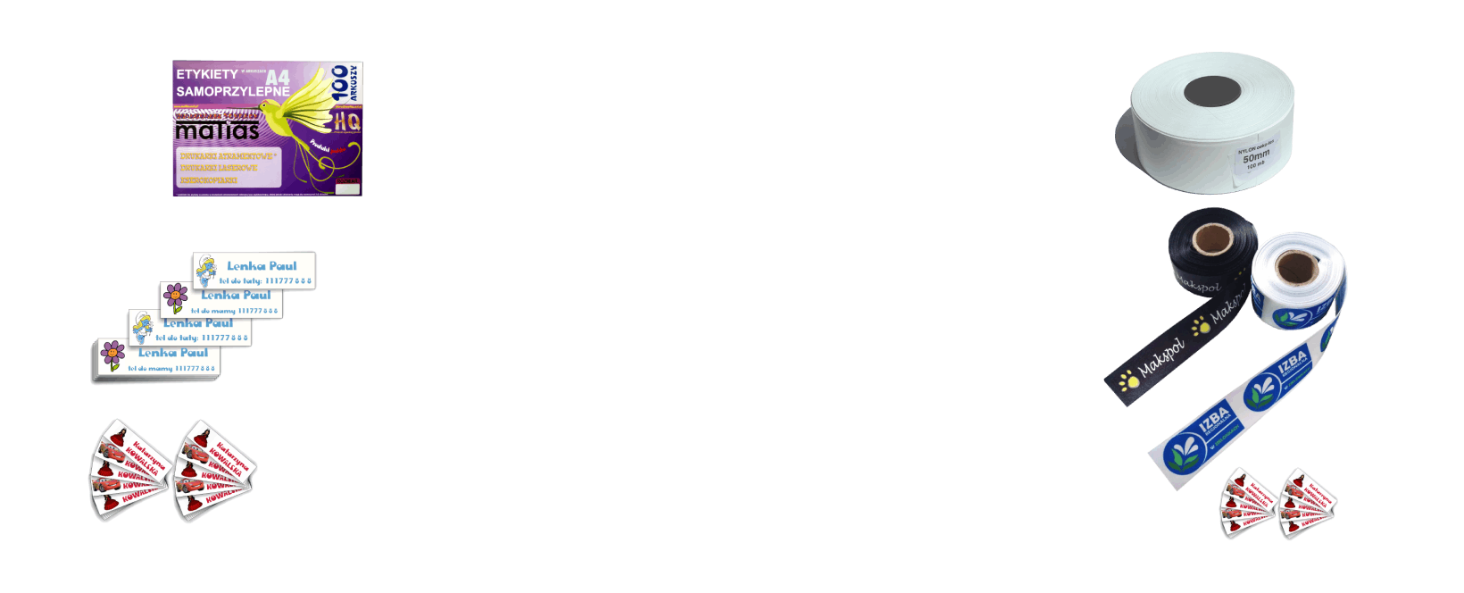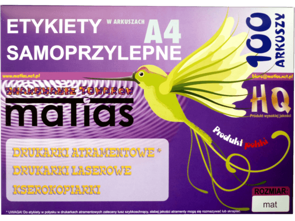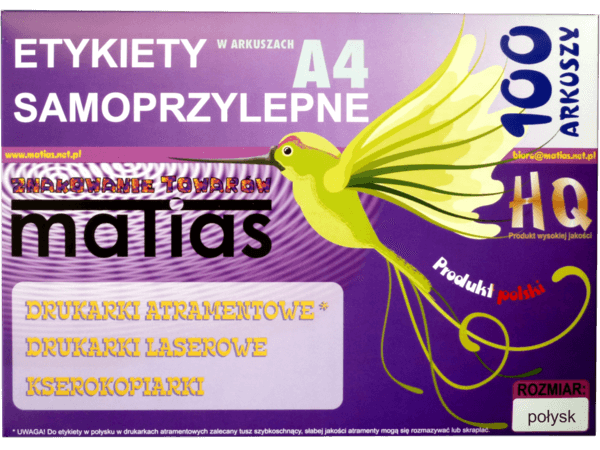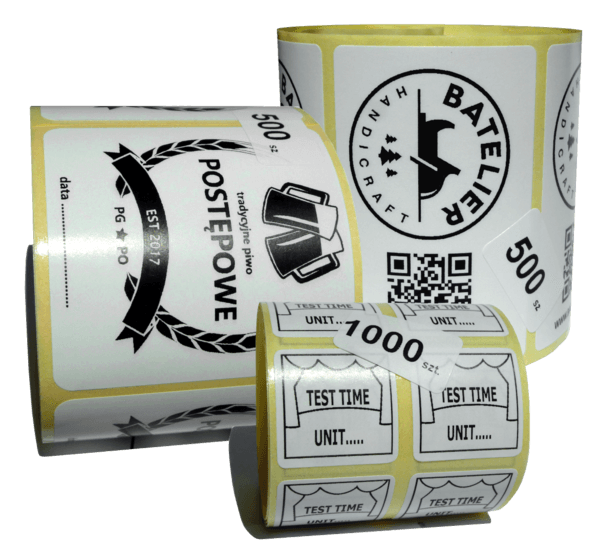 Etykiety wyprodukowane w Polsce, wykonane z wysokiej jakości surowca dostarczonego przez renomowaną Firmę Avery Dennison (wynalazcę etykiety samoprzylepnej). Zapewniają znakomitą jakość druku w drukarkach atramentowych, cyfrowych, laserowych i kserokopiarkach, łatwą aplikację, bardzo dobrą przyczepność do produktu. Szeroki zakres wymiarów etykiet pozwala na dopasowanie wydruku do potrzeb klienta. W przypadku dużego zamówienia istnieje możliwość wyprodukowania etykiet w arkuszach pod zamówienie klienta (konkretny wymiar).